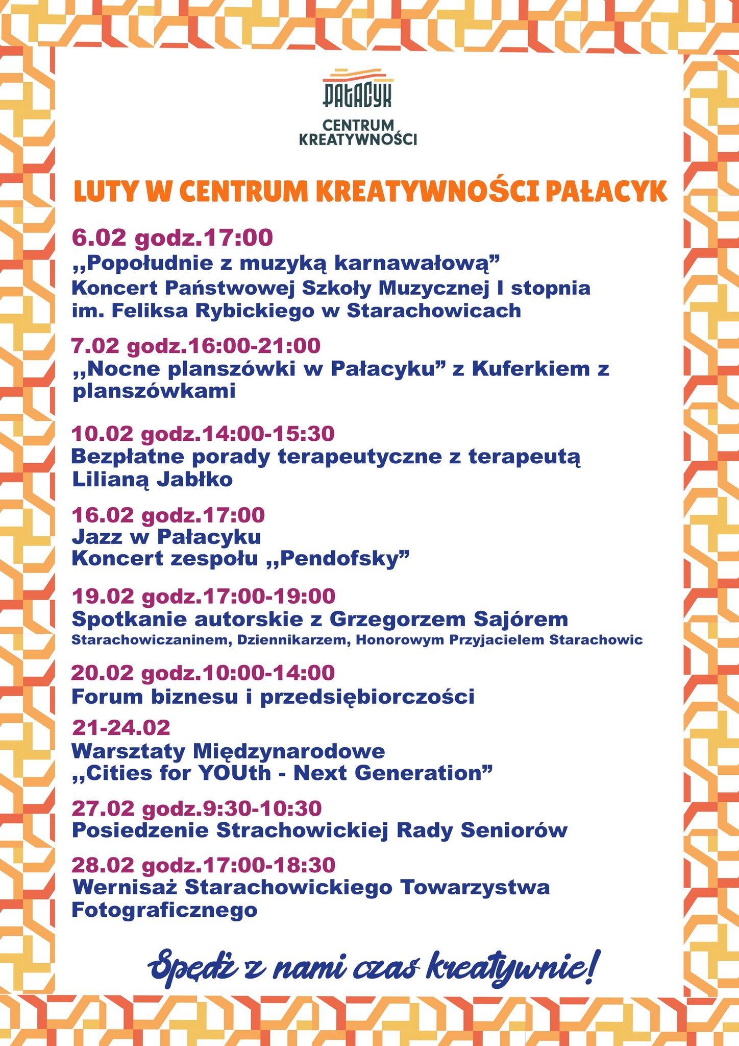 9. Fotograficzne podsumowanie miesiąca Na zakończenie lutego, 28 lutego w godz. 17:00-18:30, odbędzie się wernisaż Starachowickiego Towarzystwa Fotograficznego. Wystawa będzie prezentować prace lokalnych fotografów, ukazujące zarówno piękno miasta, jak i artystyczne spojrzenie na otaczającą rzeczywistość. Wszystkie wydarzenia odbywają się w Centrum Kreatywności Pałacyk w Starachowicach i są bezpłatne. Zachęcamy do aktywnego udziału i wspólnego spędzania czasu w atmosferze twórczej inspiracji. Więcej informacji można znaleźć na stronie internetowej oraz w mediach społecznościowych Centrum Kreatywności Pałacyk.