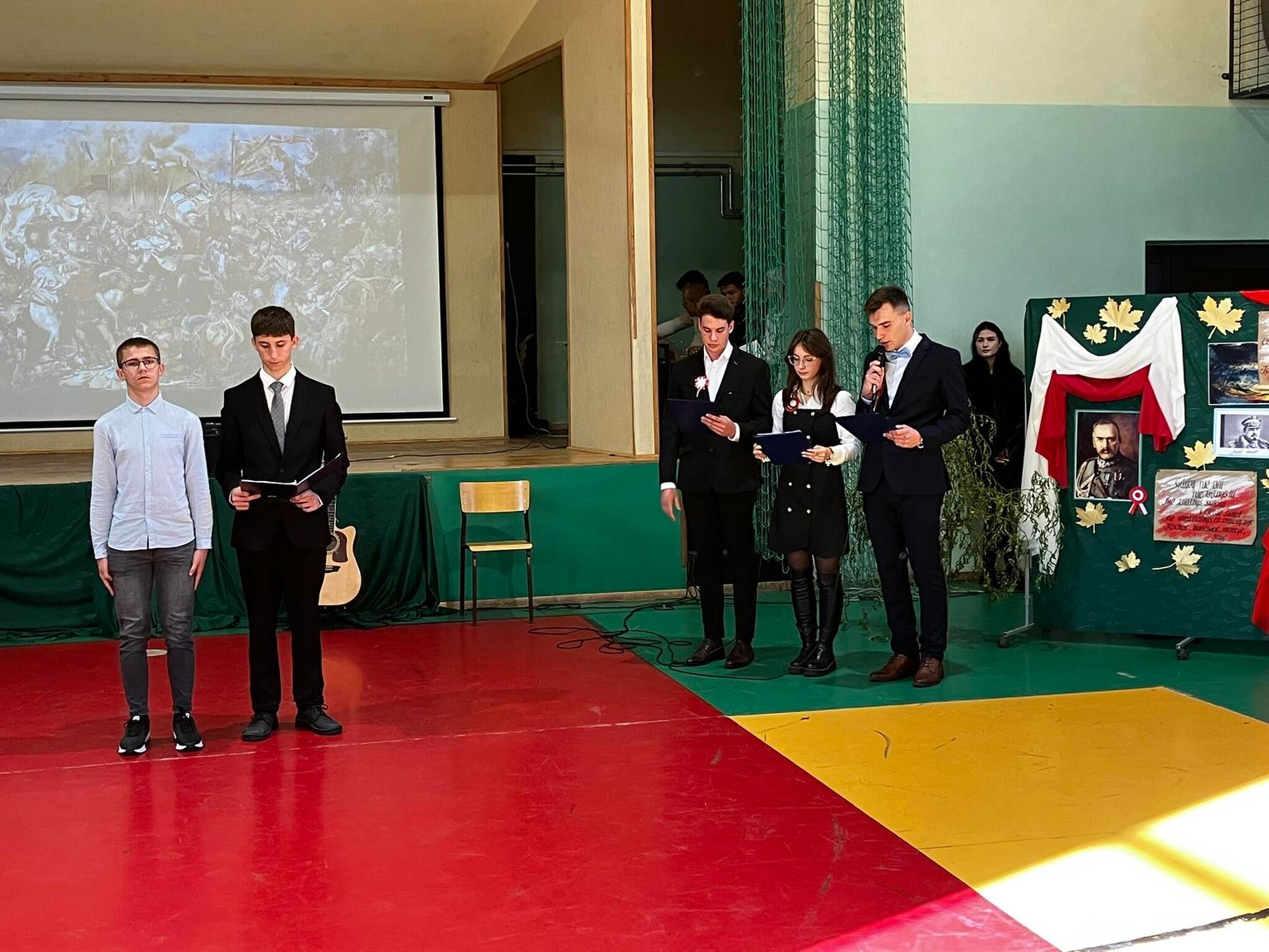 Część artystyczną przygotowali uczniowie pod kierunkiem nauczycieli: Anny Rozwadowskiej, Eweliny Surdy, Benedykta Iwoły. Program słowno-muzyczny, przeplatany wierszami i pieśniami patriotycznymi, przybliżył zgromadzonym drogę Polaków do niepodległości, od rozbiorów aż po okres po II wojnie światowej.. Uczniowie z wielkim zaangażowaniem wcielili się w role postaci historycznych: władców Rosji, Prus, Austrii - zaborców Polski oraz króla Polski Stanisława Augusta Poniatowskiego i zaprezentowali najważniejsze wydarzenia z tamtego okresu.