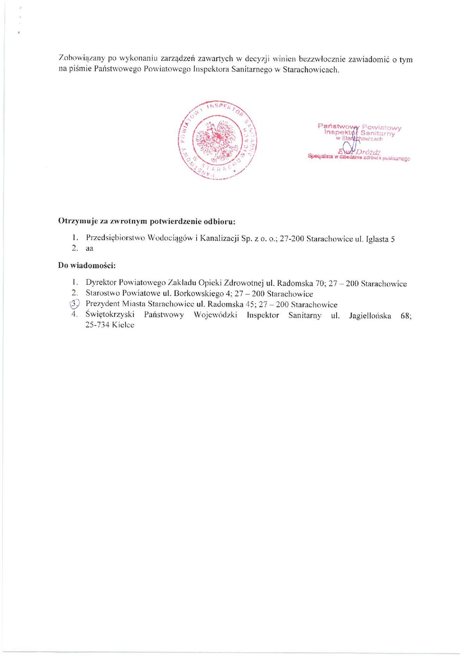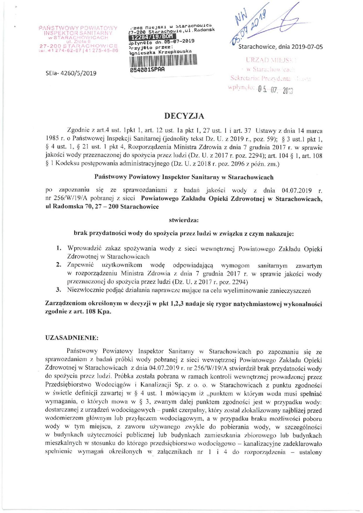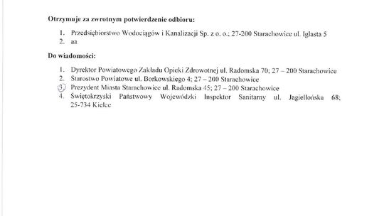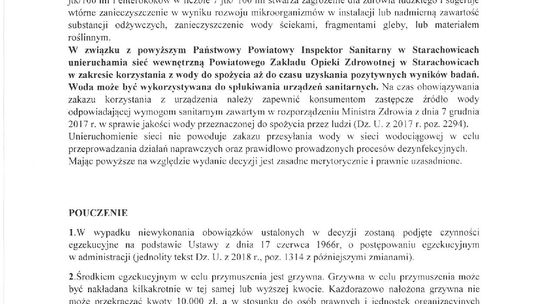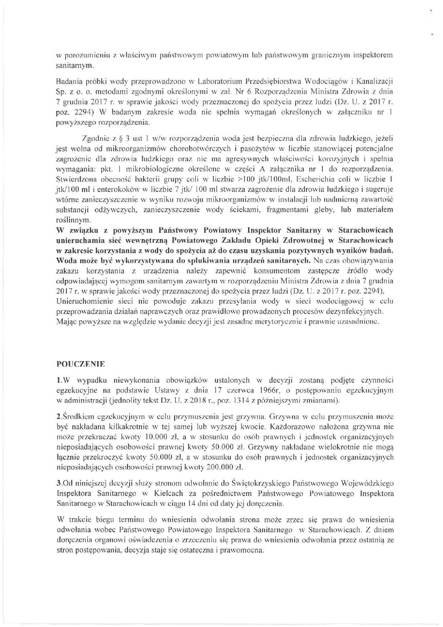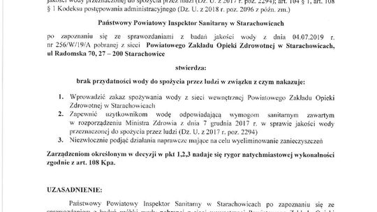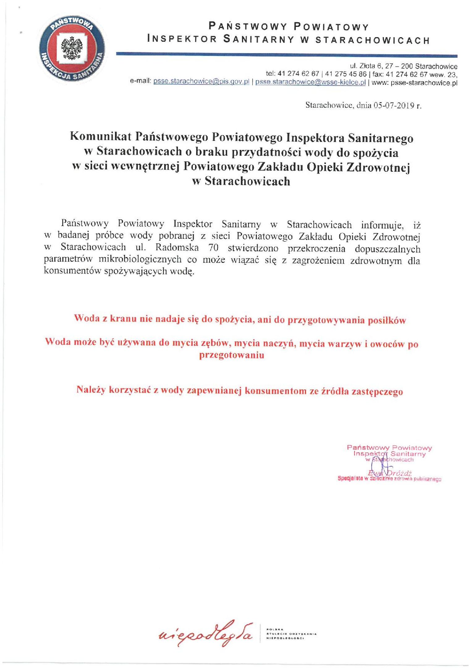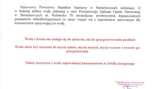 Panstwowy Powiatowy Inspektor Sanitarny w Starachowicach informuje, iż w badanej próbce wody pobranej z sieci Powiatowego Zakładu Opieki Zdrowotnej w Starachowicach, stwierdzono przekroczenia dopuszczalnych parametrów mikrobiologicznych co może wiązać się zagrożeniem zdrowotnym dla konsumentów spożywających wodę.