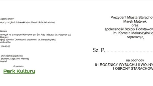 Prezydent Miasta Starachowice Marek Materek oraz społeczność Szkoły Podstawowej nr 13 im. Kornela Makuszyńskiego w Starachowicach zapraszają na obchody 81. rocznicy wybuchu II wojny światowej oraz obrony Starachowic.