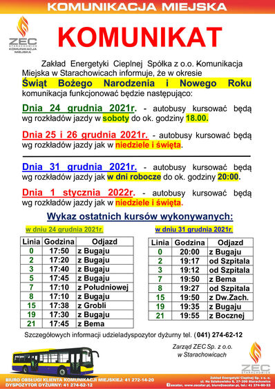 Zakład Energetyki Cieplnej Sp. z o. o. – Komunikacja Miejska w Starachowicach informuje, że w okresie Świąt Bożego Narodzenia i Nowego Roku komunikacja funkcjonować będzie następująco:
